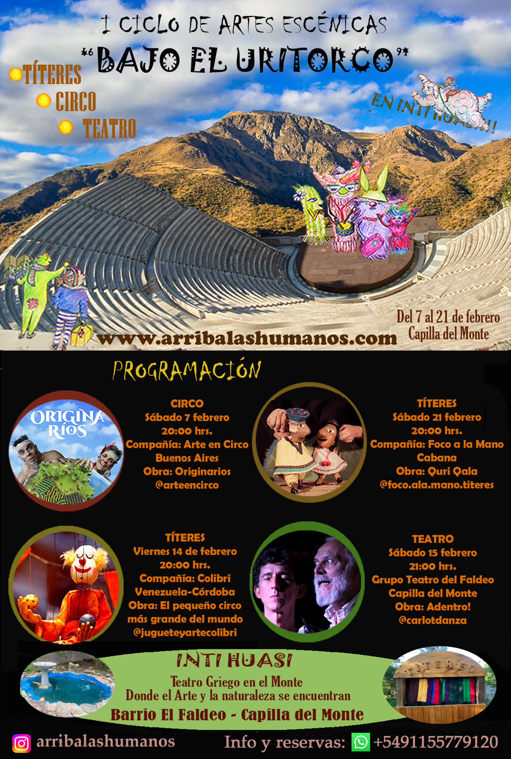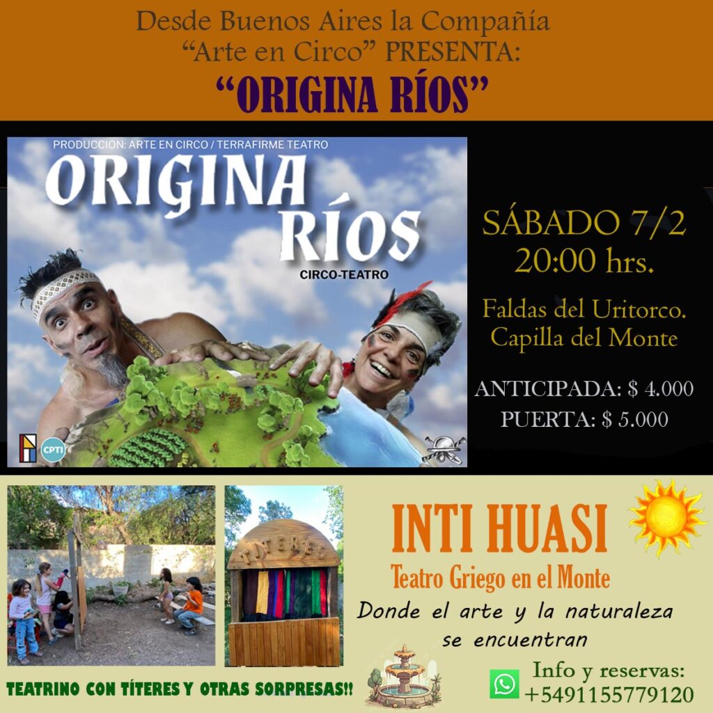 Vení a conocer este mágico espacio situado en las Faldas del Cerro Uritorco, en el que no sólo disfrutarás de un espectáculo de Artes Escénicas en un entorno natural, donde el canto de los pajaritos y la suave brisa del viento sobre las hojas de centenarios árboles nativos son la música de fondo, sino que también podrás jugar en un Teatrino de Guante con títeres y podrás experimentar la magia del Teatro de Sombras con títeres planos y con diferentes partes del cuerpo y la Fuente de los Leones, con cañas y peces, caimanes, tiburones y anguilas para pescar! Y como si esto fuera poco, pronto inauguramos el Rincón de lectura.