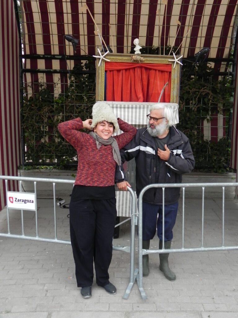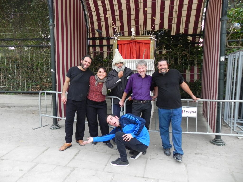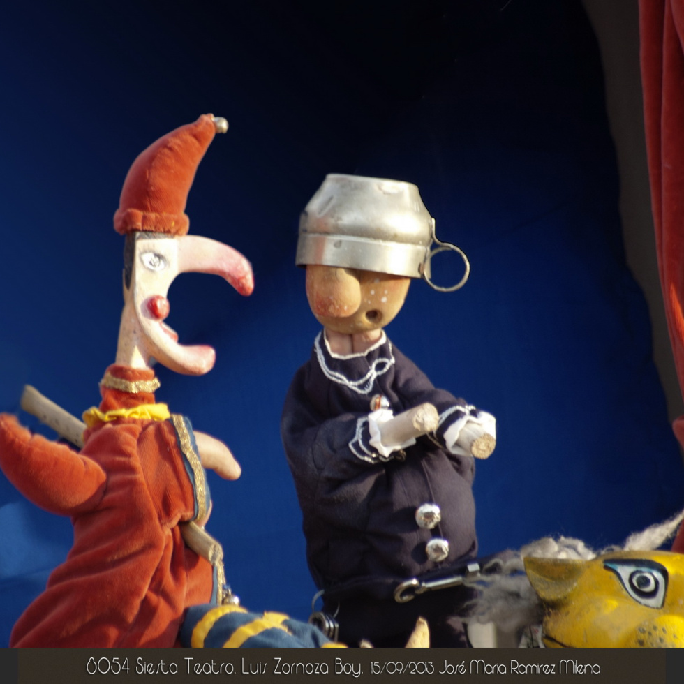 Tuvimos la oportunidad de conocer a Luis Zornoza Boy, director e intérprete de la Compañía Siesta Teatro en el marco de nuestra mutua participación del festival “Parque de las Marionetas” en la ciudad de Zaragoza en el 2016, en nuestra primera gira al viejo continente. Allí estaba Luis con su irreverencia, con sus botas, con su sombrero, paseándose antes y después de la función enérgico, bromista y alegre charlando con todos los otros colegas, con los niños y cualquiera que se asomase cerca de nuestros teatrinos, que se encontraban dispuestos en un círculo alrededor del quiosco de la música. Allí, comenzaba el espectáculo a cargo de una banda de música balcánica que daba inicio a la ronda de funciones. Primero comenzábamos, en una diagonal, Eudald Ferré, titiritero que mantiene viva la tradición del títere catalán, y nosotrxs, haciendo función al unísono. Ni bien terminaban nuestras funciones, adaptaciones de una duración de 15 minutos, ante la cual se agolpaban a veces más de 300 personas, comenzaban, también en simultáneo, las funciones de Luis Sornoza y de Eder de Paiva, un brasilero mamulengueiro radicado en Francia. Luis animaba a su Pulcinella que luchaba contra un lobo que en realidad era un tigre y no vacilaba en vociferar noticias actuales. La tela del teatrino no llegaba al piso, para dejar al descubierto sus pies, que adentro de un largo par de botas negras de goma, bailaban al compás de las peleas y las idas y vueltas de los títeres. En el frente del teatrino, en la zona baja, había una ventana con una tela semitranslúcida que nos dejaba al descubierto los procedimientos alquímicos de un titiritero de larga barba blanca llamado Luis, cuando al introducir sus manos en los títeres que cuelgan boca abajo inertes, les entrega ánima. Durante los cuatro días que dura el festival compartimos cada una de las comidas, compartiendo, contándonos anécdotas, hablando de la profesión, de las obras, de los años, del público. A bordo de una Zaragoza convulsionada por las Fiestas del Pilar, éramos un grupo de titiriterxs conmocionados por nuestro encuentro. Y sobre todo, nos la pasábamos riendo, porque Luis es muy divertido.